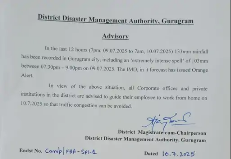 गुरुग्राम के डिप्टी कमिश्नर की ओर से शहर की सभी आईटी और कॉर्पोरेट कंपनियों को एडवाइजरी जारी की गई है। इसमें अपील की गई है कि कर्मचारियों को वर्क फ्रॉम होम (WFH) की सुविधा दी जाए, ताकि सड़कों पर जाम से बचा जा सके और लोग सुरक्षित रहें।