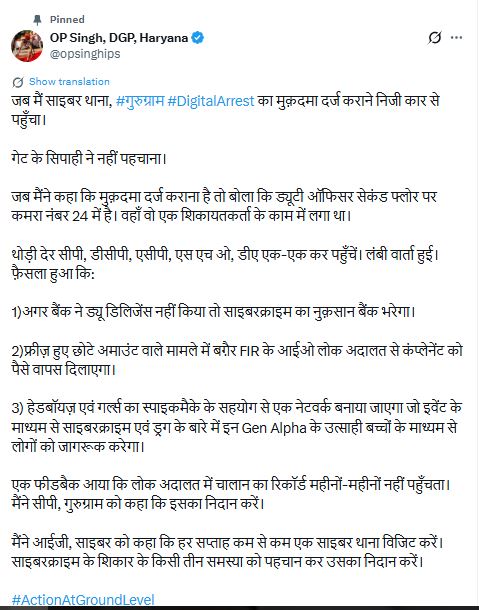 इसके अलावा हरियाणा के आईजी (साइबर) को हर सप्ताह कम से कम एक साइबर थाना विजिट करने और वहां के तीन सबसे बड़े मामलों का मौके पर निदान करने के लिए सख्त हिदायत दी गई।