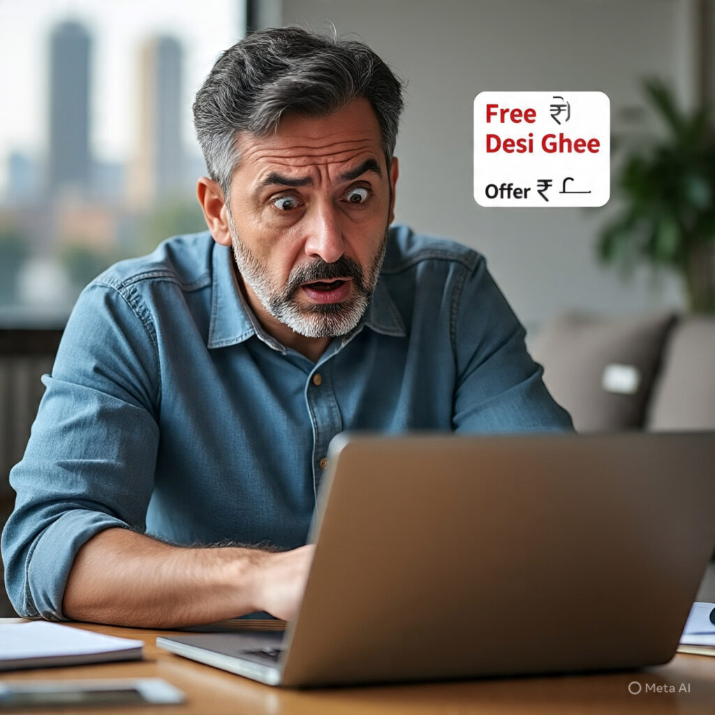 गुरुग्राम के हरि नगर निवासी मुनेश कुमार ने साइबर पुलिस को दी शिकायत में बताया कि वह बीते दिनों फेसबुक चला रहे थे। इस दौरान उन्हें “फ्री में देसी घी” पाने का एक विज्ञापन दिखाई दिया।