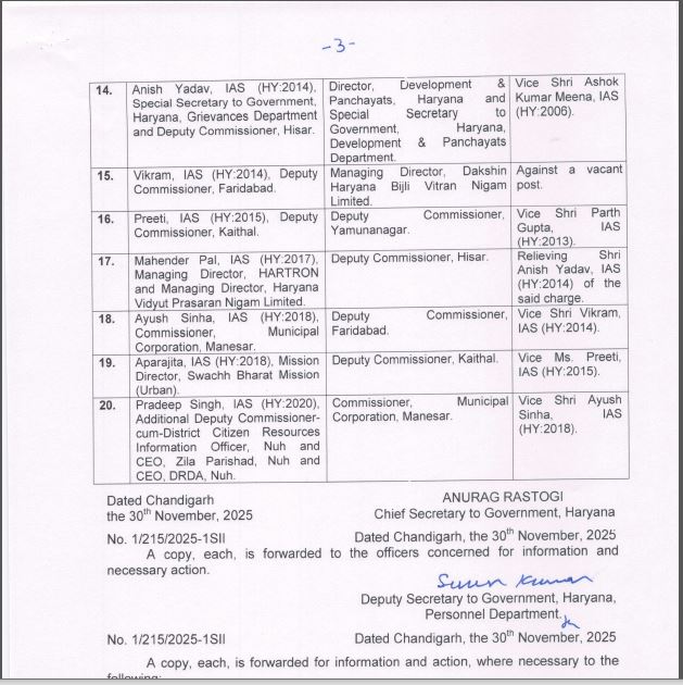 वर्तमान आयुक्त आयुष सिन्हा का तबादला कर उन्हें फरीदाबाद के जिला उपायुक्त पद पर नियुक्त किया गया है।
