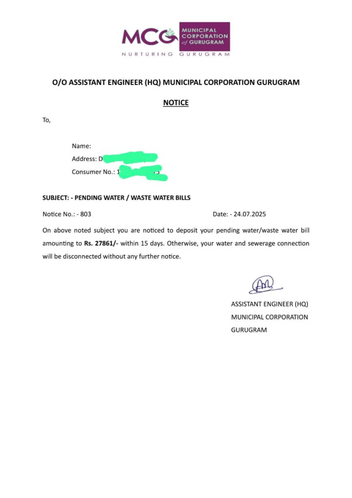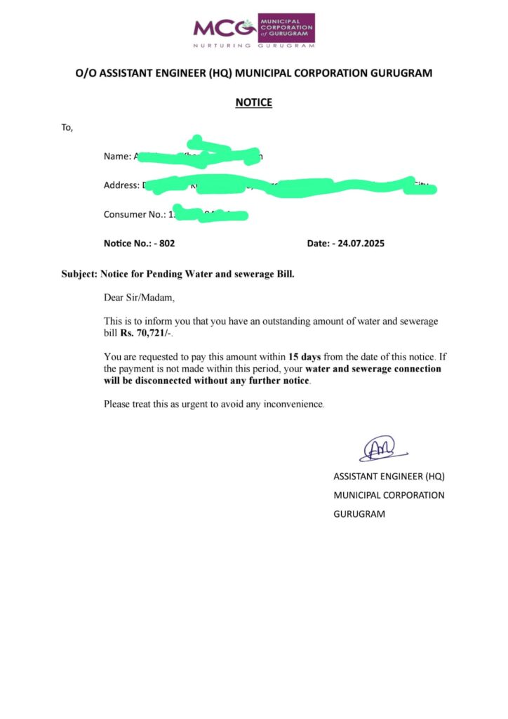 नगर निगम गुरुग्राम ने शहरभर में 17,373 अवैध पेयजल कनेक्शनों की पहचान की है। निगम अब इन सभी उपभोक्ताओं को नोटिस जारी कर रहा है, जिसमें उन्हें 15 दिन के भीतर बकाया राशि का भुगतान करने और वैध मीटर्ड जल कनेक्शन लेने के निर्देश दिए गए हैं।